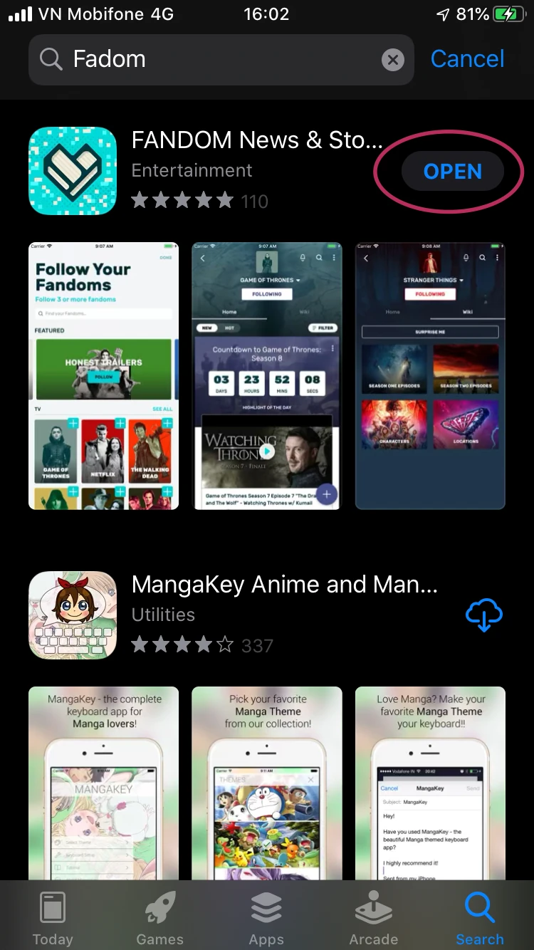 Đầu tiên, các bạn mở "App store" trong máy và tìm "Fandom", xong tải ứng dụng có hình trái tim như hình dưới.