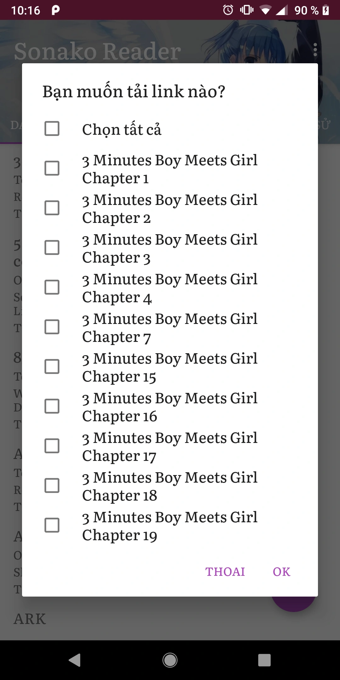 Chương trình sẽ hiển thị tất cả chương truyện có xuất hiện trong trang chủ. Bạn chỉ cần chọn chương mình muốn, hoặc tất cả, rồi bấm OK. App sẽ bắt đầu tải ngay. Tốc độ sẽ phụ thuộc vào đường truyền. Bạn có thể kêu gọi chức năng này từ trong trang đọc bằng cách bấm vào nút 3 chấm trên thanh tiêu đề, rồi chọn "Tải hàng loạt chương truyện".